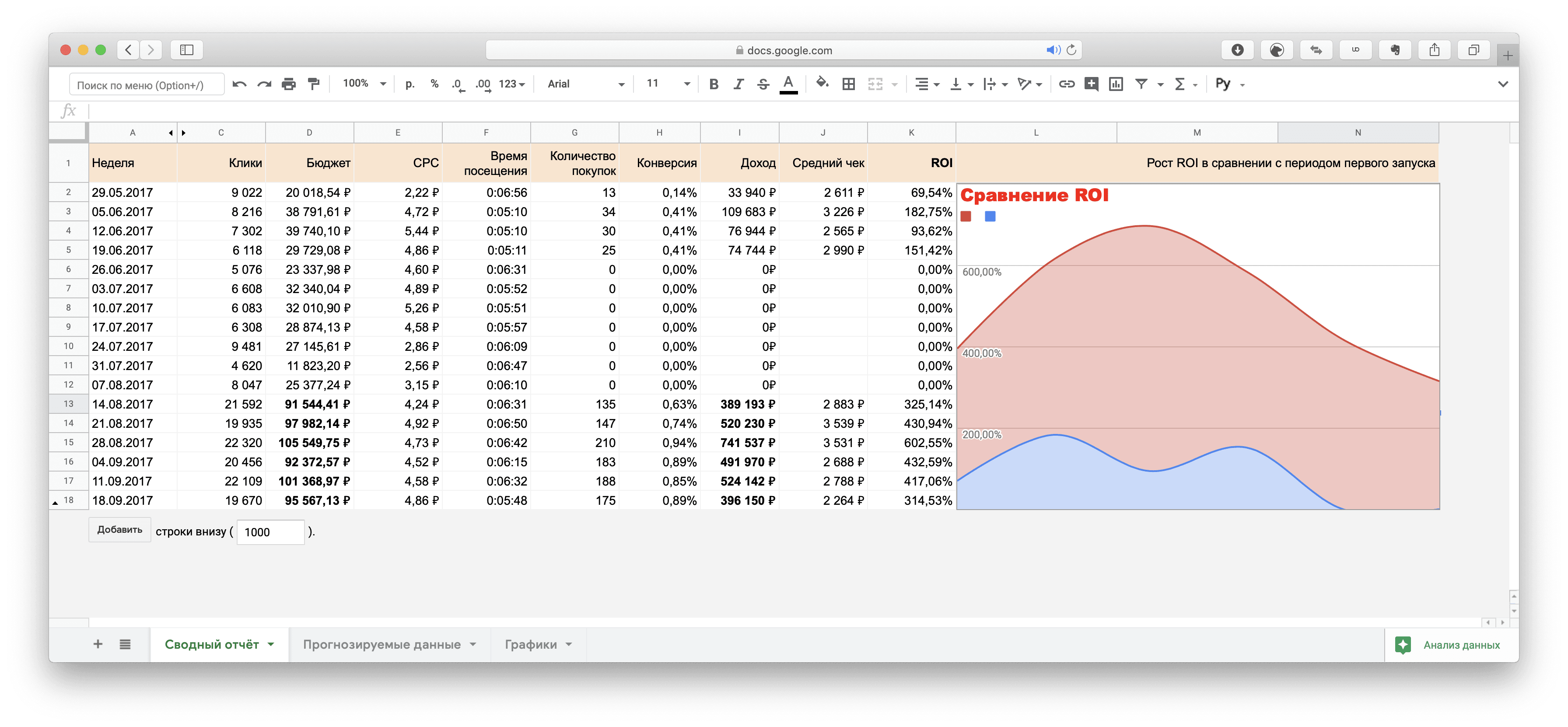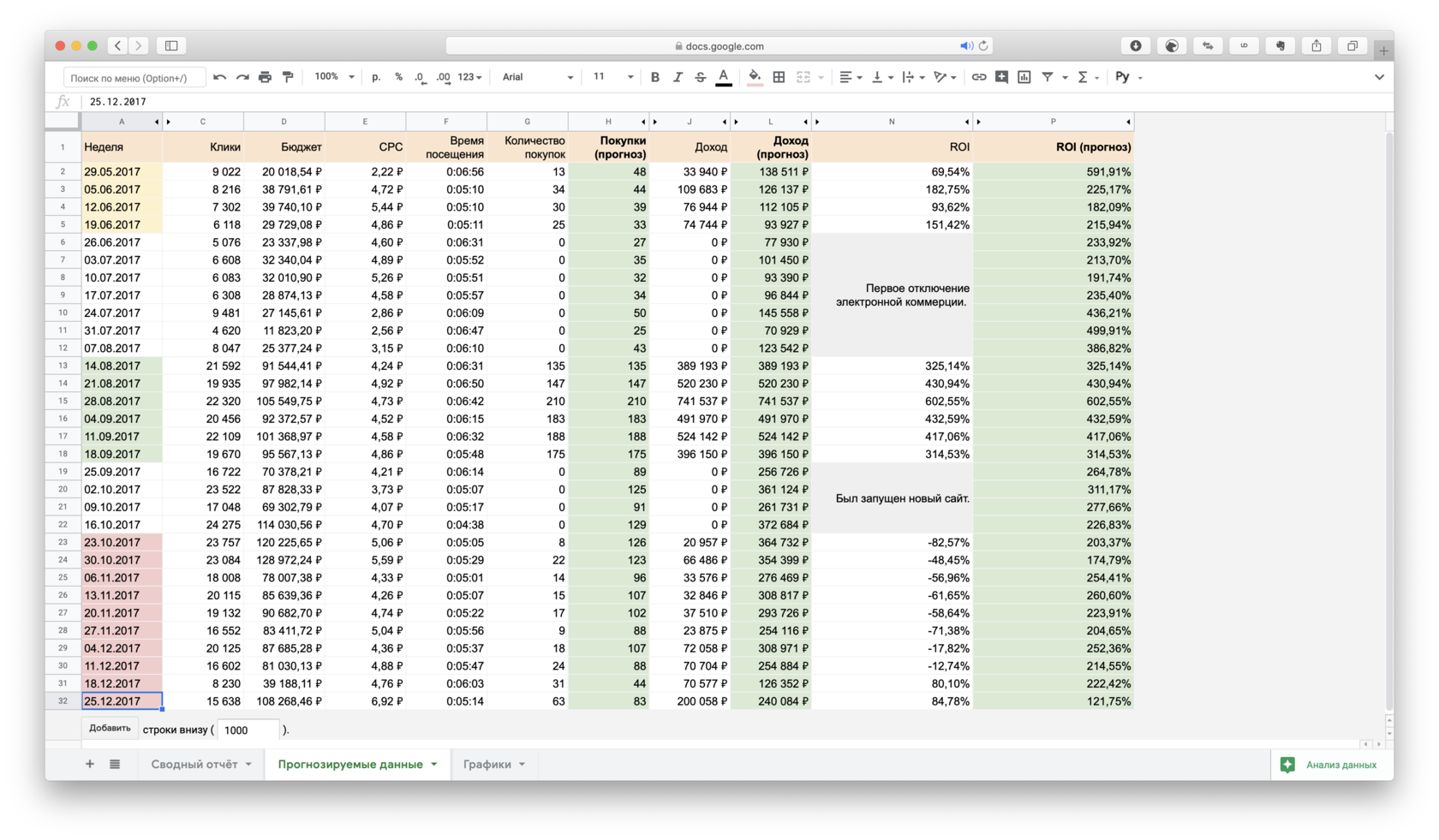 Решили воссоздать всю картину с перебоями аналитики, написать отчёт-хронологию и спрогнозировать реальные цифры, на основе тех 6-ти недель, когда данные собирались верно, и показатели были правильные. Мы исходили из того, что если показатели рекламы не изменились, сайт работает исправно и средний чек не изменился — реклама, на самом деле, выгодна. И мы можем это показать в отчётах, как если бы Гугл Аналитикс работал корректно.
