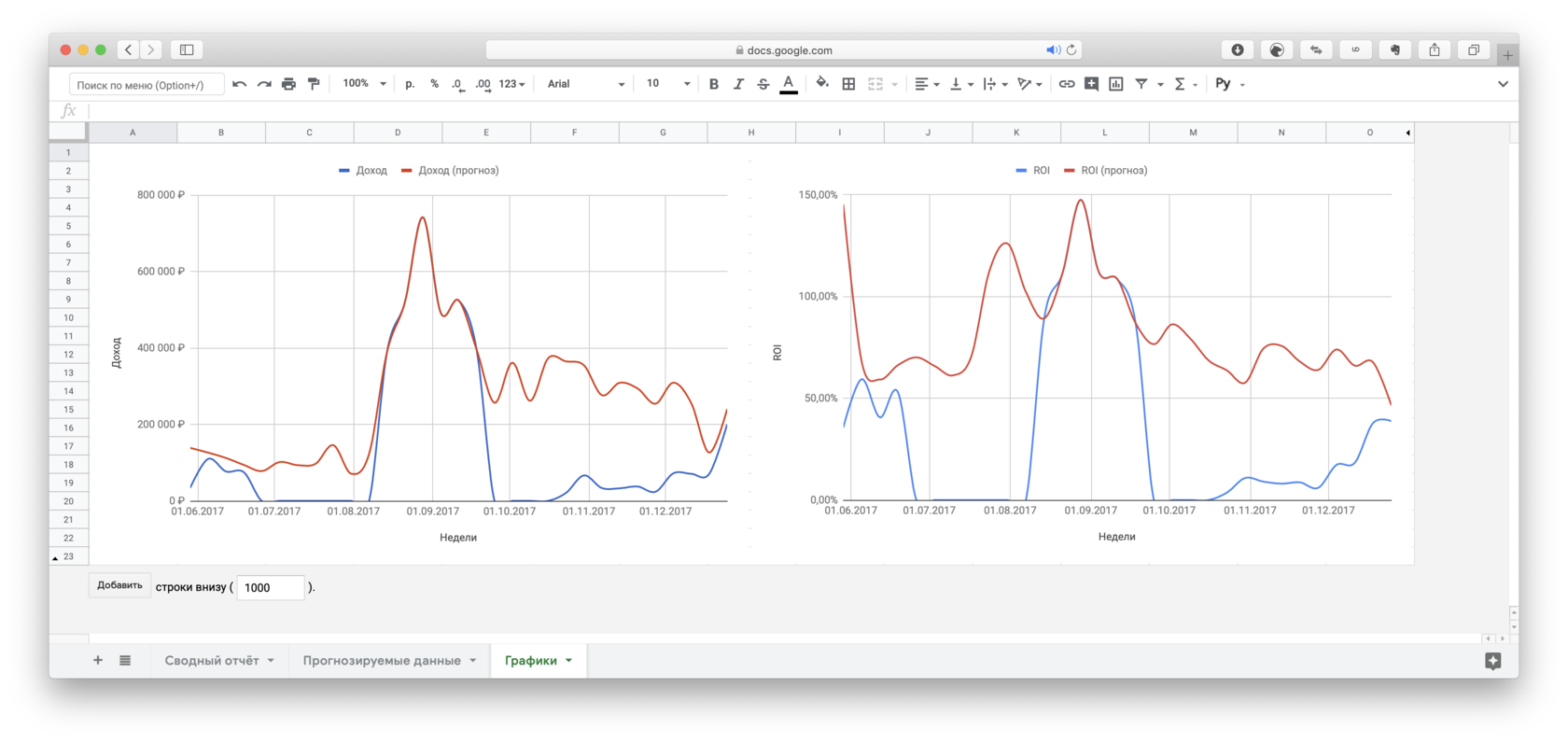 Итак, мы собрали отчёт, в котором показали реальные данные, которые фиксирует Гугл Аналитикс, и прогнозируемые данные: