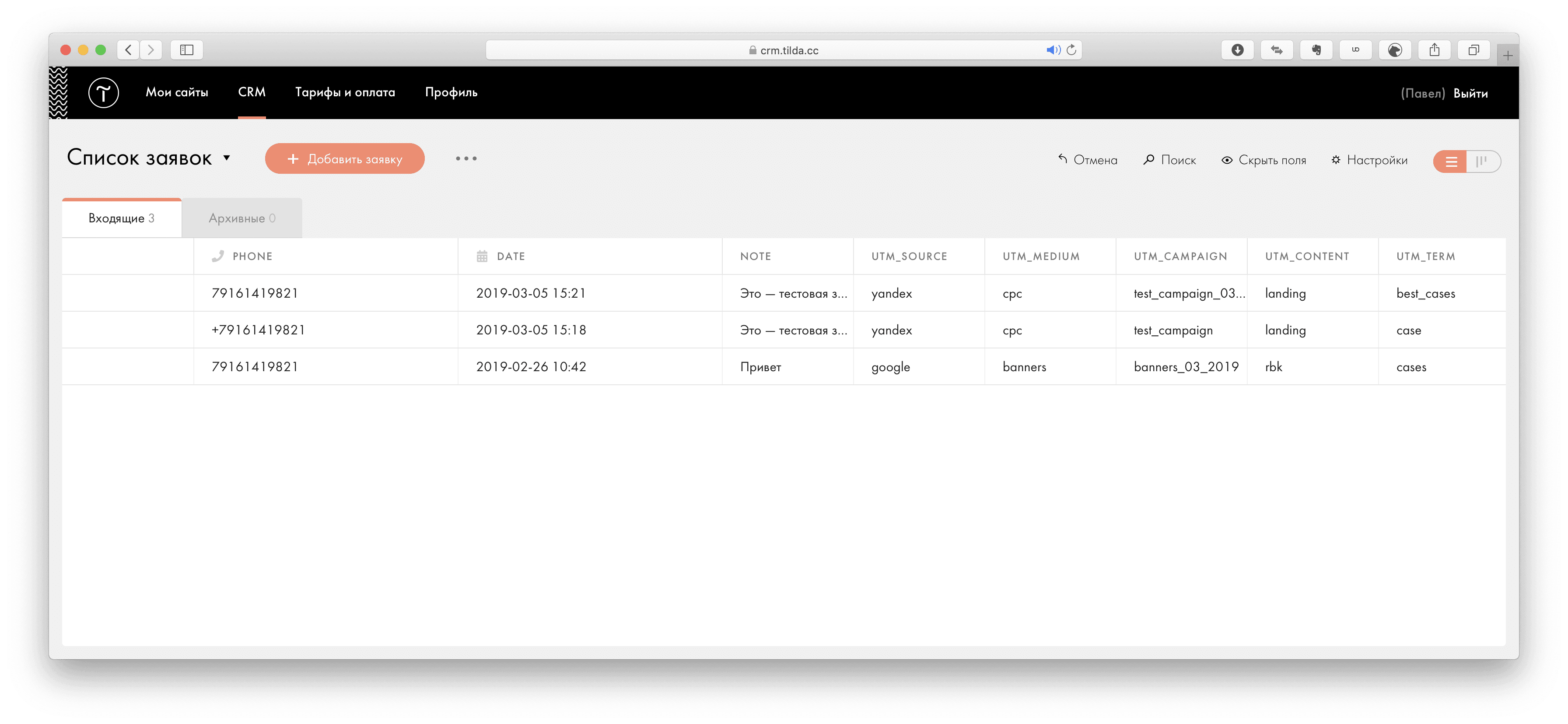 Третий способ — использовать конструкторы. Если вы принимаете заявки через CRM Тильды, источники рекламных переходов будут записываться автоматически. Достаточно убедиться, что рекламные кампании размечены UTM метками.