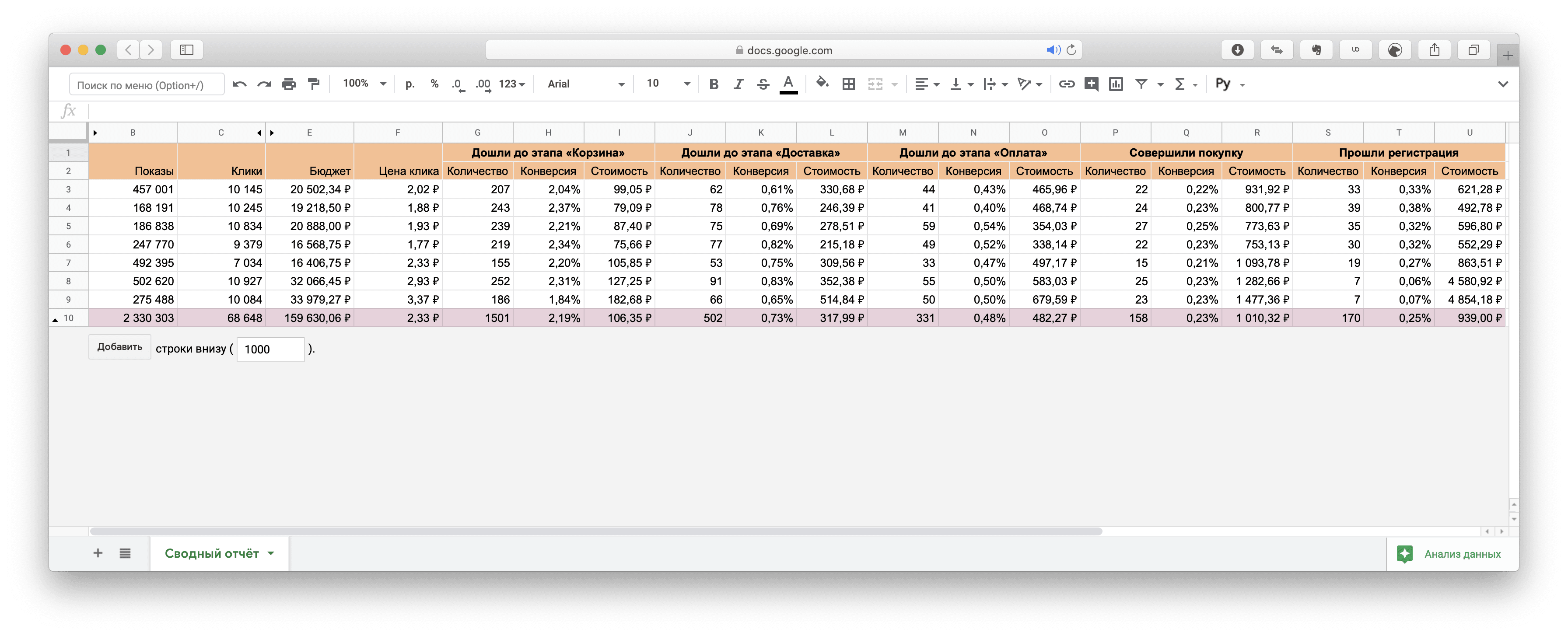 Мы считали базовые параметры: от момента захода человека на сайт до совершения покупки. Эта воронка важна, чтобы понимать, на каком этапе мы теряем клиентов.