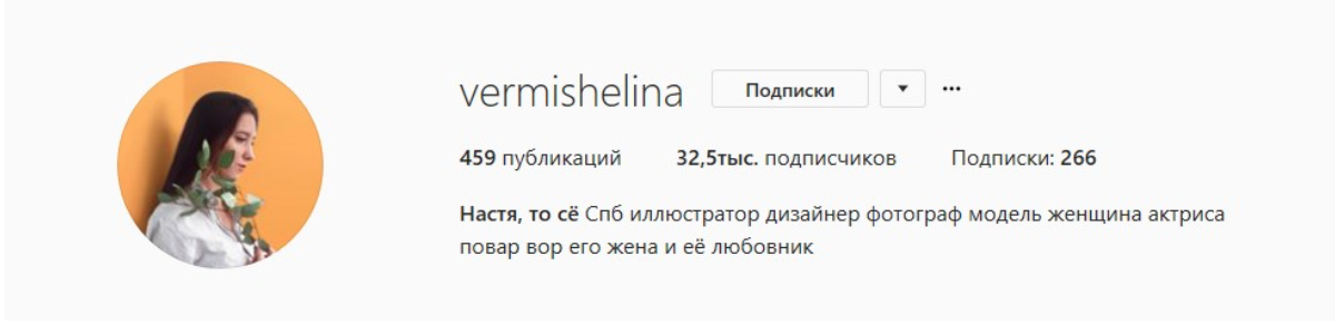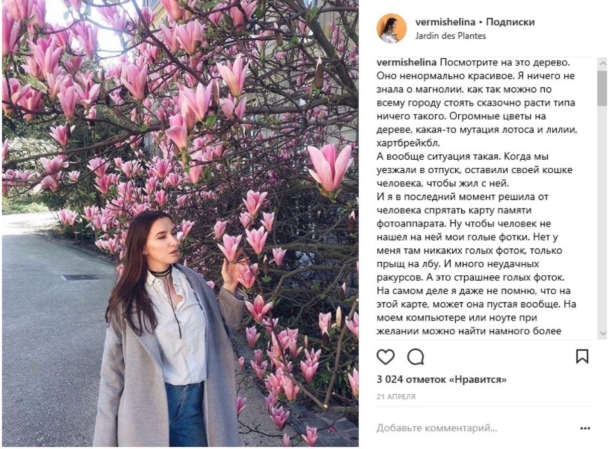 ‟Сейчас у меня 33 тысячи подписчиков. Из них активных, тех, кто лайкает и комментирует, около 4 %. Это очень хороший результат для личного блога. Ещё год назад на моей странице было всего 600 человек. Конечно, никакой конкретной темы аккаунта не было. Просто Я. Я с подругой, я на концерте, я в кафе, в машине. Даже подписи не ставила. Когда я стала наблюдать, что у некоторых моих знакомых по 2000, у некоторых 5000 фолловеров, я заинтересовалась темой привлечения подписчиков.