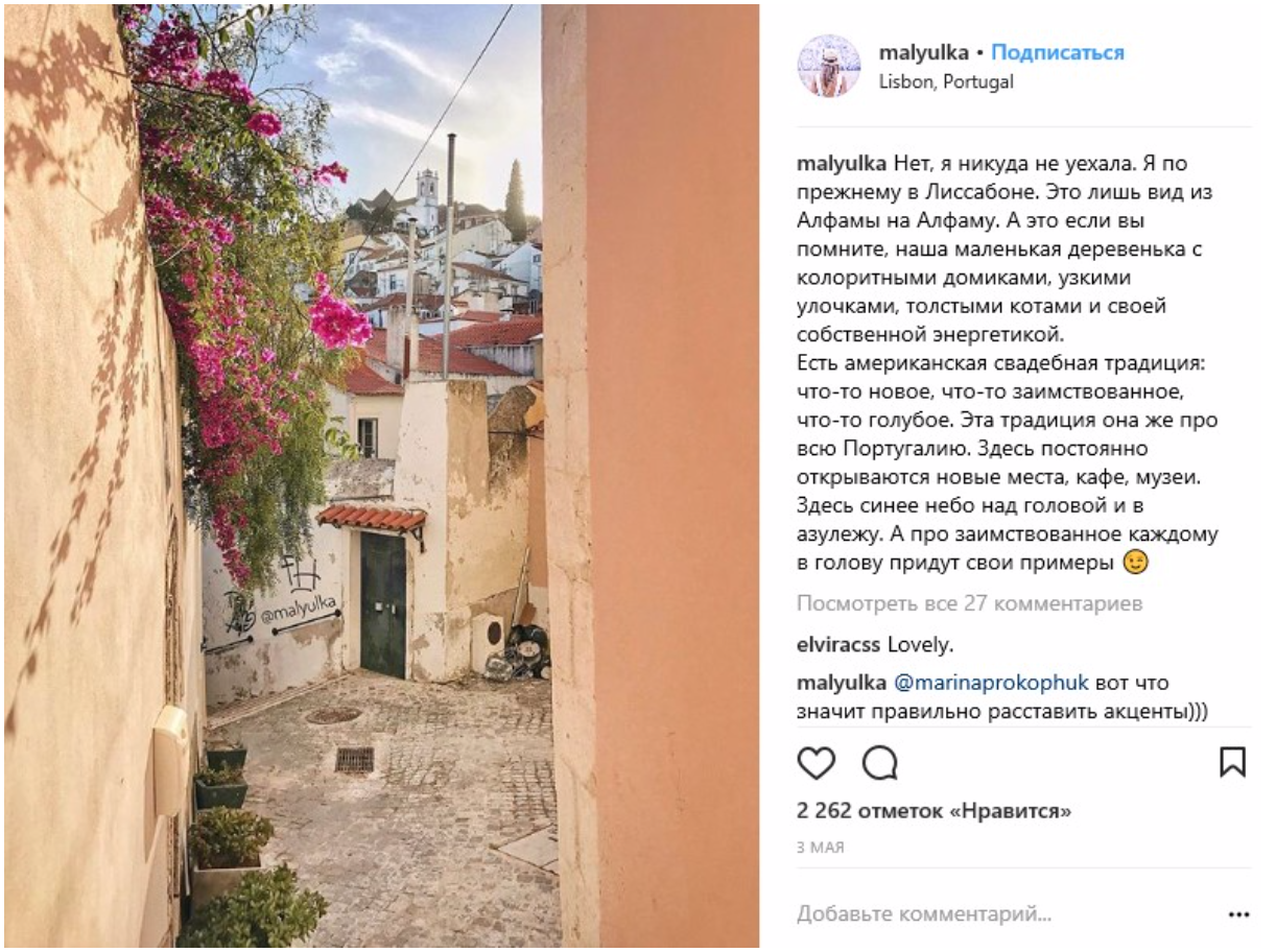 ‟ Я никогда не думала, что на меня подпишется много людей, потому что мне казалось: ну, красивые фотографии — и что. А потом в какой-то момент я начала больше информации добавлять, о чём-то рассказывать, и оно потихонечку пошло. Людям стало нравиться. Они начали задавать вопросы. Я потихонечку понимала, зачем веду. По Лиссабону на русском языке нормальных аккаунтов нет в принципе. Только 2 аккаунта от фотографов — и на этом всё.