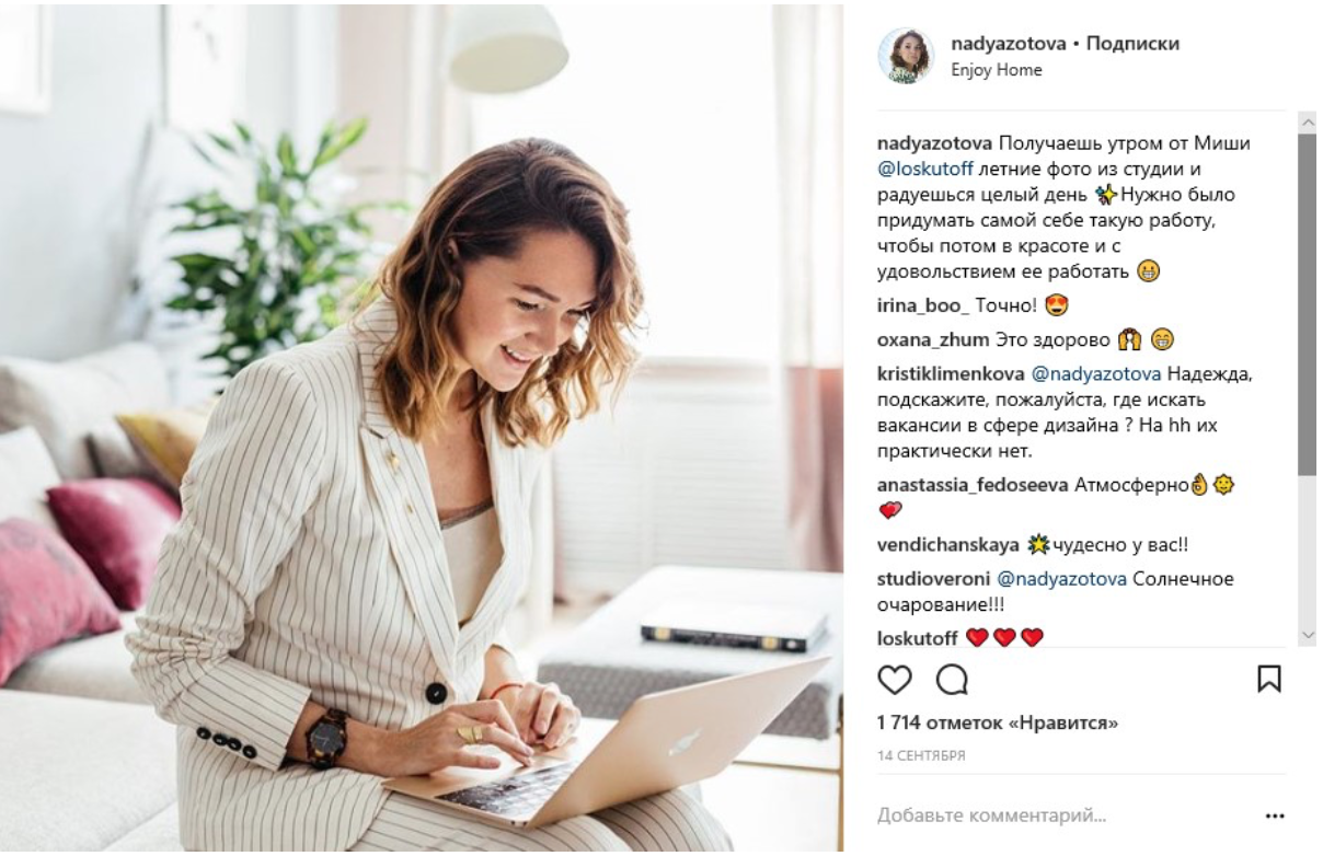 ‟Это, скорее, было логичным продолжением моего блога в ЖЖ. Задача была — делиться тем, что я вижу, что я знаю. Когда я завела свой блог, я только начала учиться дизайну интерьера, и мне было интересно делиться своими находками. Я находила большой отклик у читателей, потому что в те далекие годы, в 2009, что ли, не было никаких блогов об интерьерах, не было дизайнеров, которые всё это пишут, поэтому Instagram изначально был логичным продолжением. Я делилась своими находками, путешествиями, идеями, вдохновением. Рассказывала в принципе о том, как я работаю над проектами, что я делаю. Делилась советами. В общем, активно общалась со своими подписчиками. Можно сказать, что так и продолжается по большому счёту.