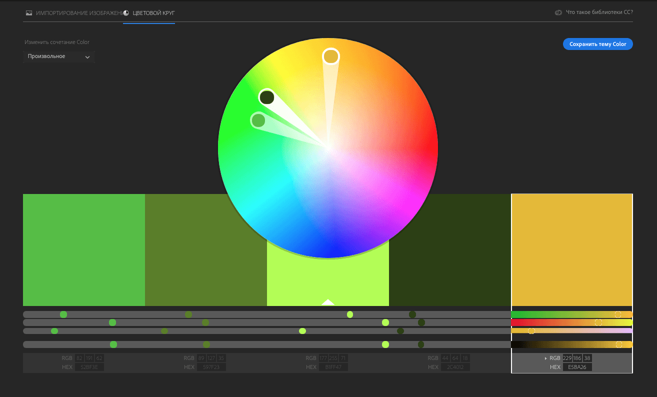 Самое идеальное в работе — сервис от Adobe. В нем можно подобрать цвета и сразу посмотреть на гаммы, которые создавали другие люди. Не забудьте сохранить номера цветов, когда подберете гамму.