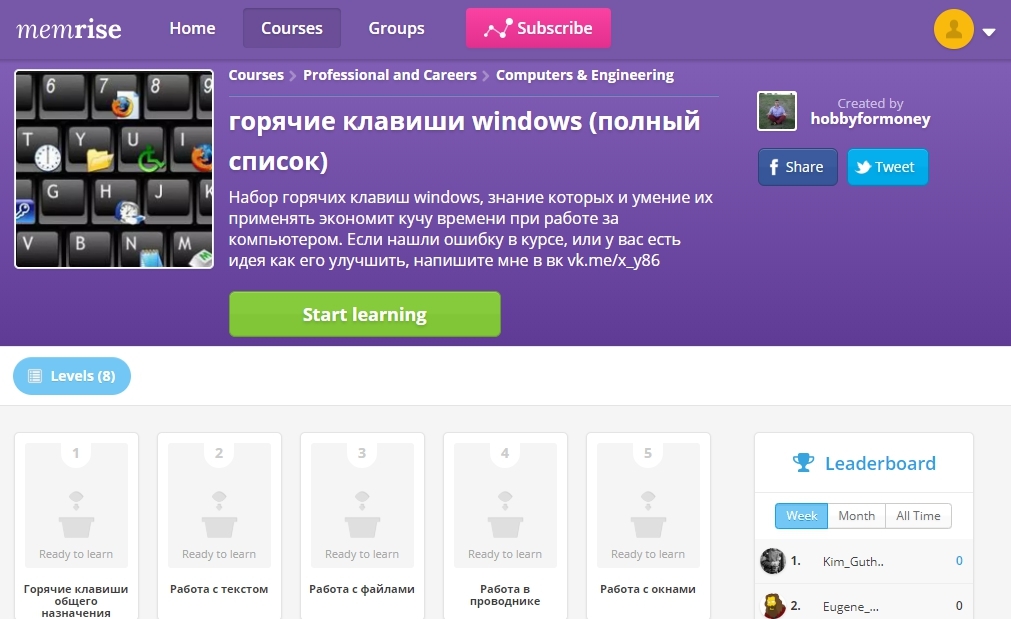 Memrise — сервис для изучения английского, немецкого, французского, испанского, корейского, итальянского, японского, арабского или польского. Здесь курсы разделены на темы, есть упражнения в разной форме. Но самое интересное в Мемрайс не это. В каждый язык и категорию пользователи могут добавлять собственные курс. Здесь можно найти очень специфические подборки, например, горячие клавиши Windows или код Морзе.