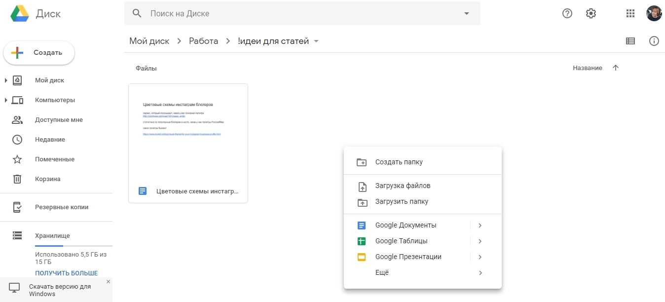 В Гугл Документах вы можете создавать текстовые документы, таблицы и презентации. Все это прекрасно скачивается в традиционных форматах doc, excel, powerpoint, pdf. Доступ к файлу можно раздать отдельным пользователям или сразу всем, ограничив взаимодействие только просмотром или комментированием. Работать можно как онлайн, так и оффлайн.