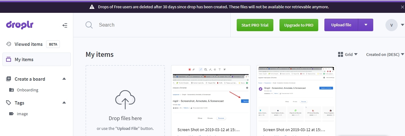 Сервис для создания скриншотов и записи видео с экрана Droplr позволяет делать скрины, гифки, делиться файлами, скрывать часть скринов, сортировать их. Функционал бесплатной версии ограничен лишь временем хранения файлов — не более 30 дней.