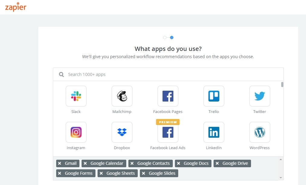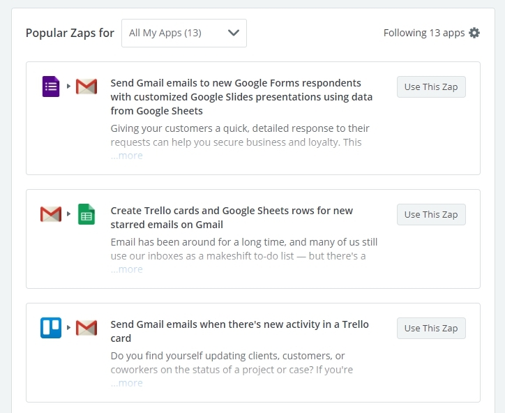 Zapier интегрирует все ваши сервисы и приложения, позволяя работать с Google почтой, файлами, Drops, Слаком и еще многим другим в одном окне. Поддерживает больше 1000 приложений. Вы можете назначить автоматизацию простых действий, например, получив файл на почту, сразу сохранить его в хранилище. Сокращает тонну рутины и высвобождает время на полезные дела. Самые часто используемые настройки Zapier высвечивает в подсказках: