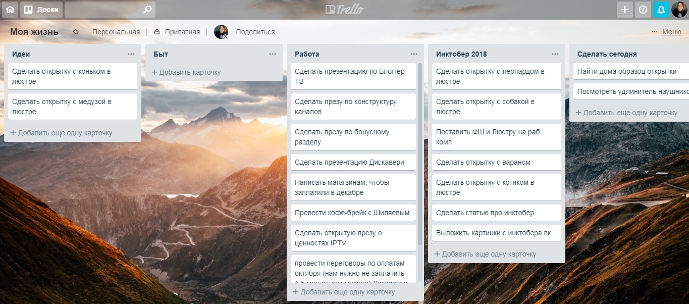 Трелло — полностью бесплатный сервис. По сравнению с Асаной, он гораздо проще в обращении и отлично подходит для личного планирования. Здесь можно назначить любое количество столбцов и карточек, сделать несколько досок, поставить фон и создать команды.