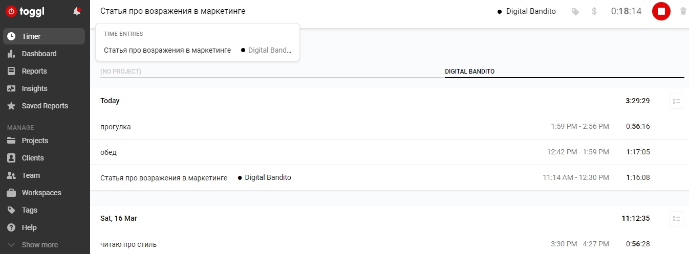 ‟ Кроме агентства, я использую Тоггл и для себя лично. Он нужен, чтобы понимать, сколько ресурса уходит на какую задачу и заранее прогнозировать время. Сначала вы просто считаете свое время и начинаете фиксировать, сколько тратите на задачи. Я рекомендую изначально ставить себе прогноз, потом включать Тоггл, считать реальное время работы над задачей и сравнивать, насколько ваши прогнозы совпадают с действительностью.