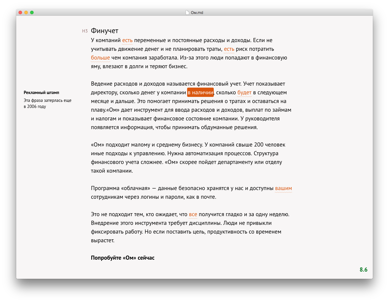Optima — удобный текстовый редактор, который позволяет осмысленно работать с текстом и фокусироваться только на нем. Режим «Дзен» делает ваш экран девственно чистым, и ничего уже не отвлекает от текста. Доступна проверка текста через Главреда, вы сразу можете писать текст в инфостиле. Поддерживает маркдаун разметку и темную тему для тех, кто любит работать ночью. Разработчик обещает вскоре добавить автоматический подсчет символом и слов и правку кавычек и тире на «ёлочки» и —.