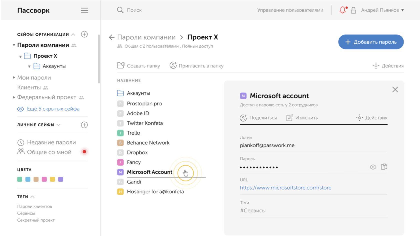 Мы используем Пассворк для коллективного хранения паролей. В нем можно создавать проекты, рабочие группы и назначать всем разные права для доступа. Есть временный доступ или только на просмотр. Так сотрудники не хранят пароли от проектов и сервисов где угодно, у них есть единое место, которое хорошо защищено и контролируется компанией. Здесь удобно хранить и личные пароли, доступ к ним будет только у вас.