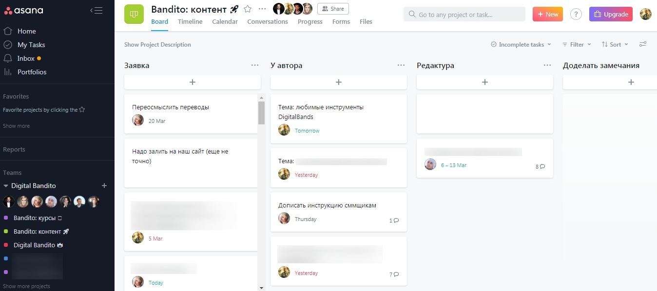 Асана — таск-менеджер, в котором мы работаем всей командой. И DigitalBands и Digital Bandito занесены туда. Мы ведем разделение по проектам и направлениям. В каждом проекте используем доски со статусами задачи — идея, в работе и т.д. Это помогает не терять задачу и сразу понимать, на каком этапе она остановилась. В любой задаче можно сделать подзадачи, которые будут высвечиваться списком, поставить ответственного и наблюдателей.