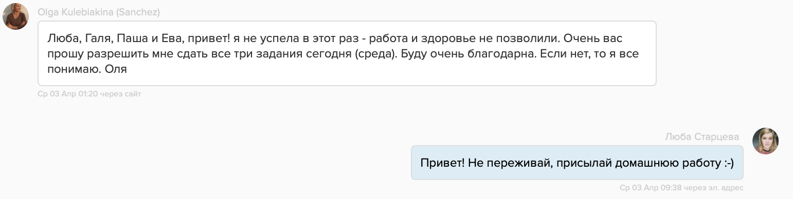 Бывает всякое, и, даже если мы ставим суровые дедлайны и не даём расслабляться, мы всегда готовы войти в положение и дать небольшую отсрочку на сдачу домашней работы. Главное этим не злоупотреблять.
