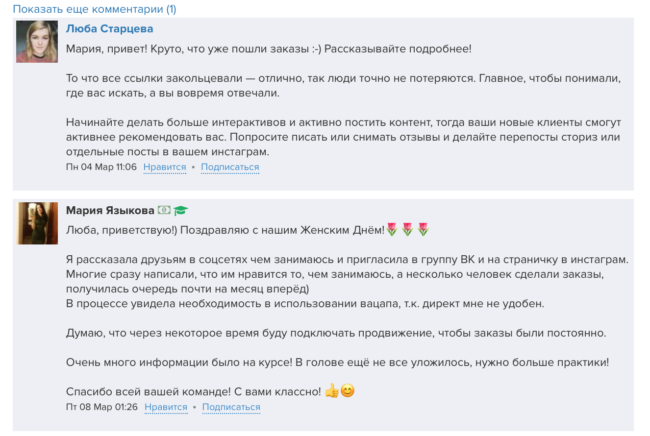 Не все уверены в том, чего они хотят и в каком направлении двигаются. Мы стараемся оказывать моральную поддержку и одновременно направлять. Так, например, выглядит разбор текста на курсе Экспресс Инстаграм. И конечно, нам всегда приятно видеть как расцветают аккаунты наших учеников уже после одного занятия